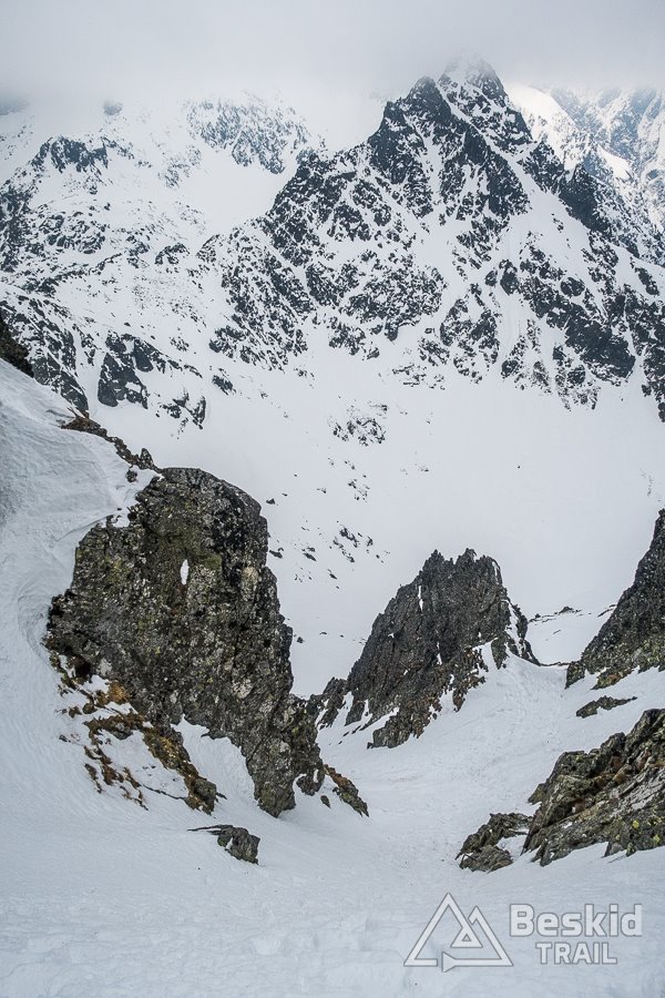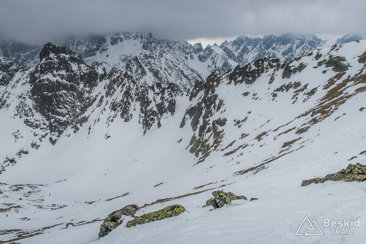 W międzyczasie z chmur nad nami nawet lekko prószył śnieg, lecz nie na tyle by w jakikolwiek sposób wpłynął na warunki zjazdowe. I – co ważne – chmury nie przysłoniły nam docelowych miejsc, na które weszliśmy, dzięki czemu mogliśmy cieszyć się widokami (choć nieco ograniczonymi 😉 ).