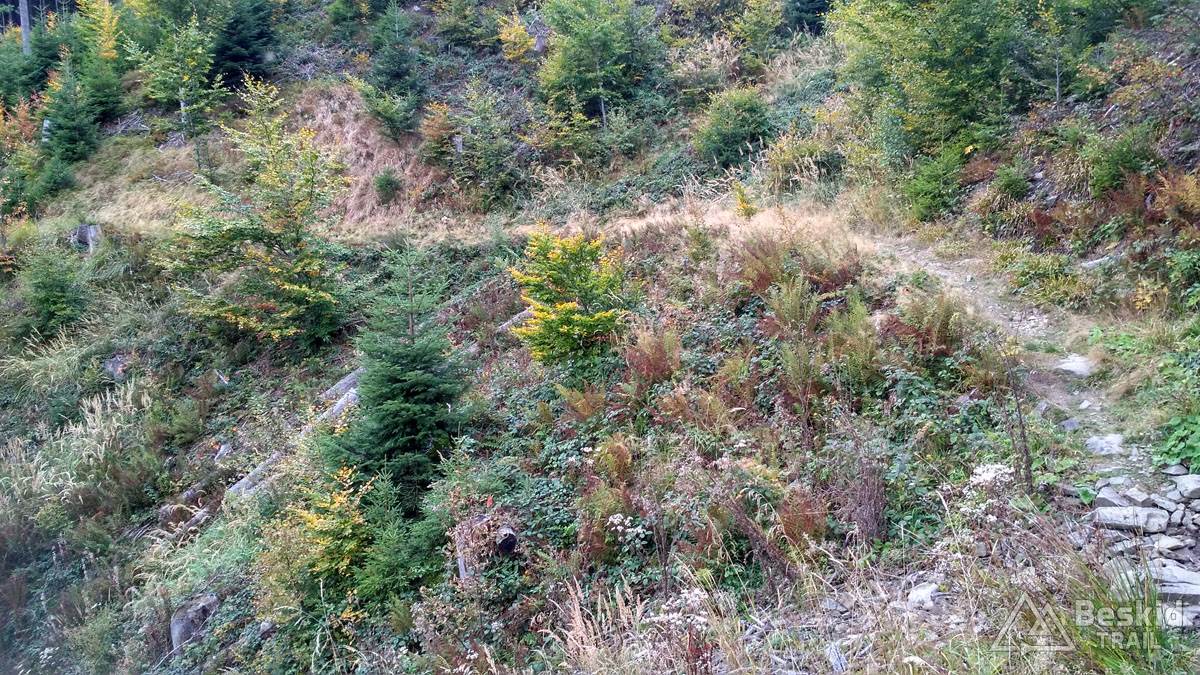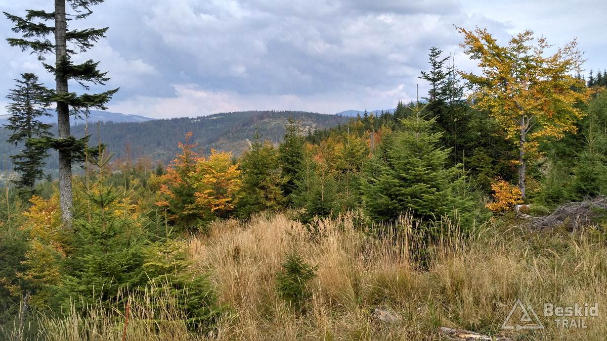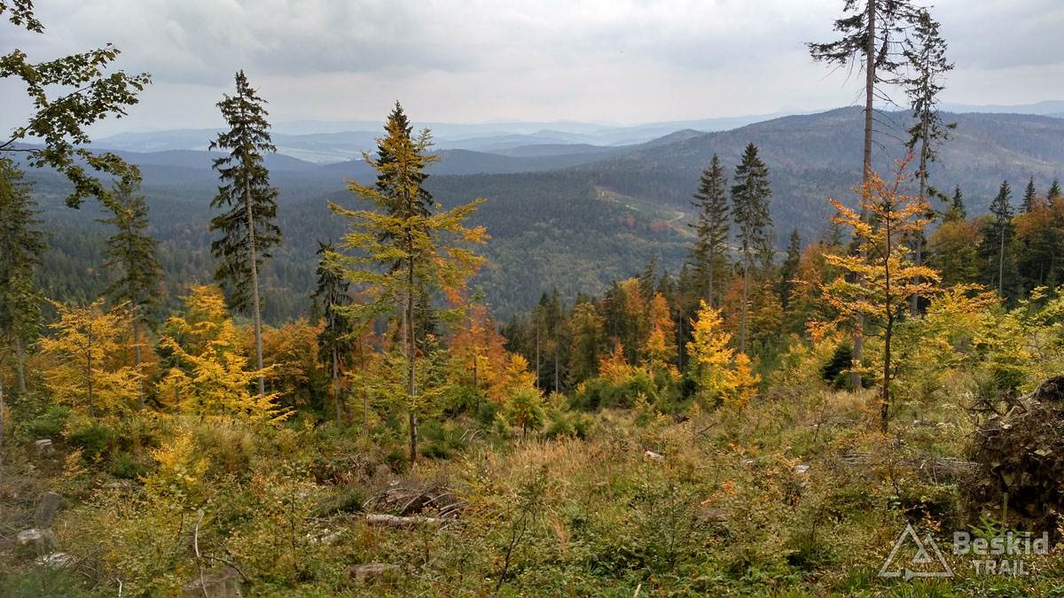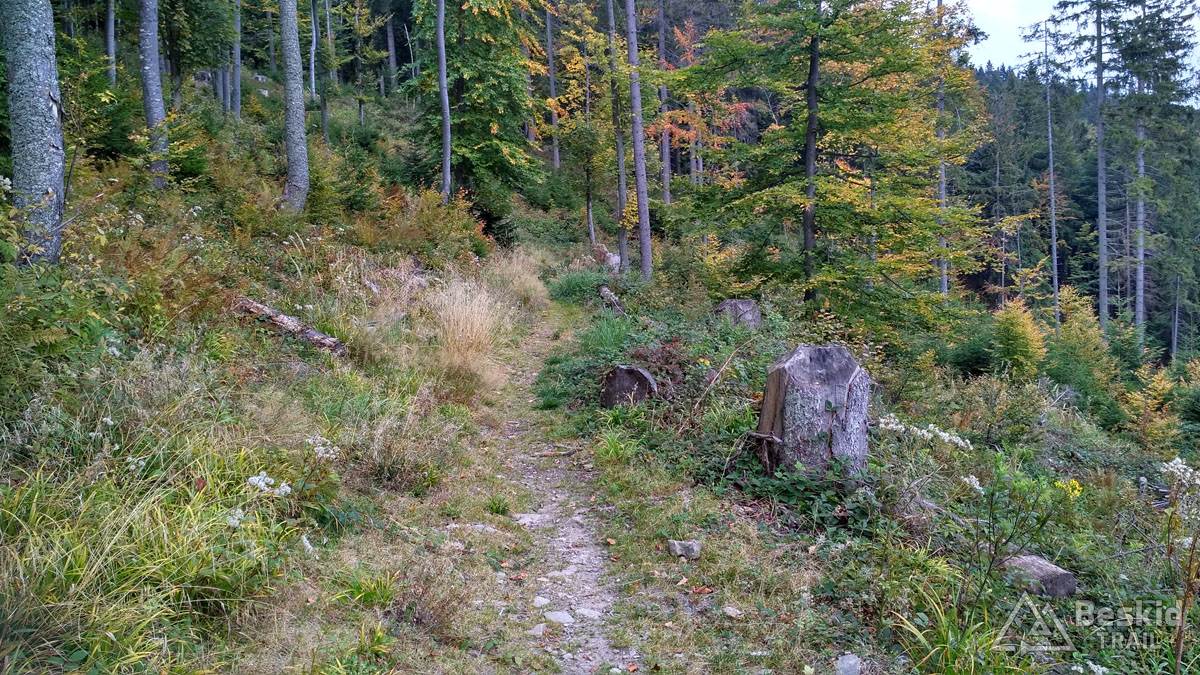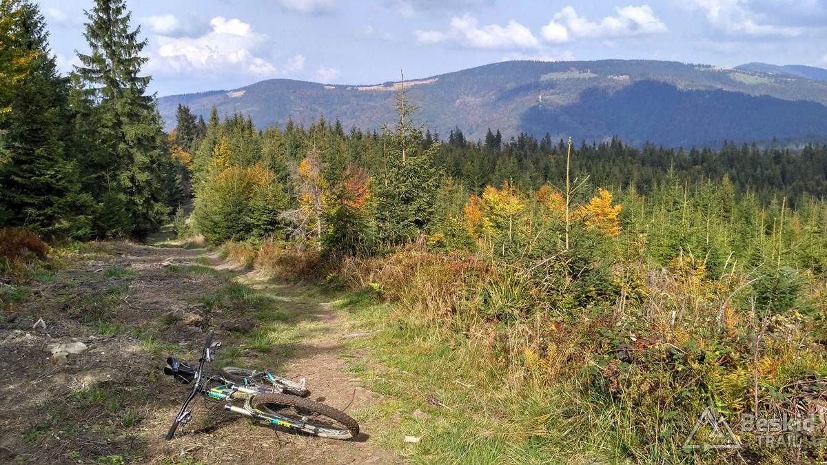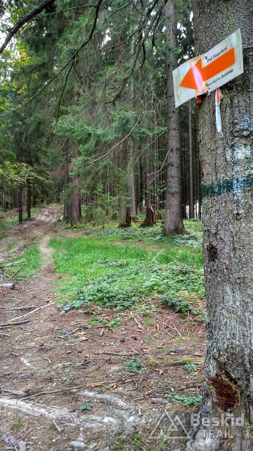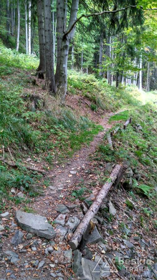 W Złatnej jak na złość pozamykane były już wszystkie (trzy) sklepiki i nie udało mi się kupić nic sensownego do picia. No cóż, nie pierwszy i pewnie nie ostatni raz to mi się zdarza. Wjeżdżam więc niebieskim szlakiem w nadziei na szybkie dotarcie do jednego ze strumyków, które go przecinają. Dopiero po pół godzinie trafia mi się wątły ciek, ale lepsze to niż nic. Po kolejnych kilkunastu minutach jazdy trafiają się bardziej wydajne potoki. A niebieskim szlakiem dawno nie jechałem. W zasadzie tę wycieczkę układałem między innymi pod niego, by móc nim wjechać. I cieszę się, że po kilku latach wciąż prezentuje się całkiem dobrze. Co prawda drwale nieco poszerzyli widoki z niego, ale za to nie zniszczyli w większości jego przejezdności. Szlak wije się kilkoma kilometrami po południowych stokach Lipowskiej i na wielu fragmentach wymaga większej precyzji od rowerzysty, dzięki czemu warto nim i w górę i w dół raz na czas się przejechać, by poćwiczyć technikę.