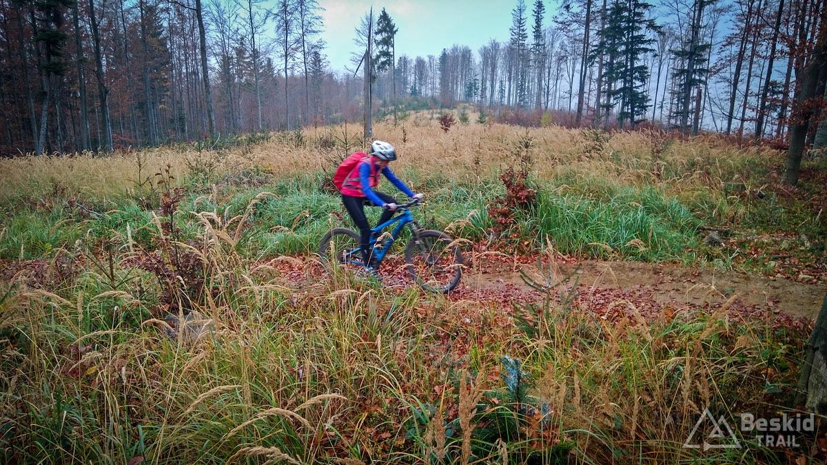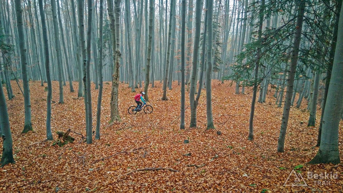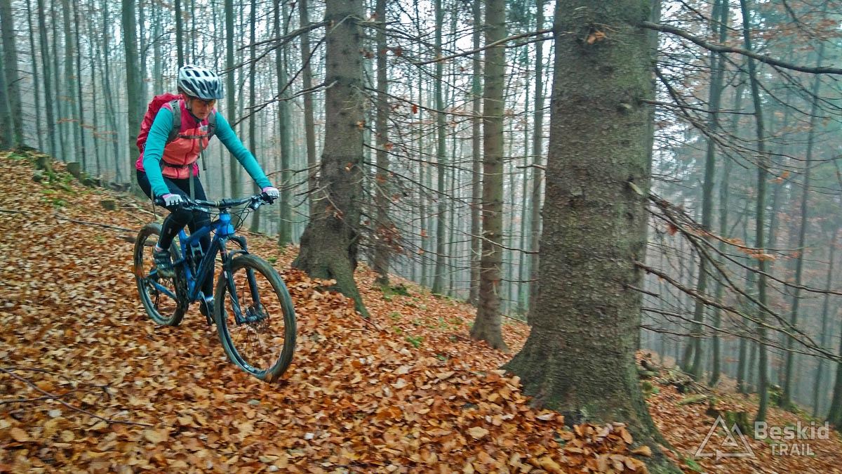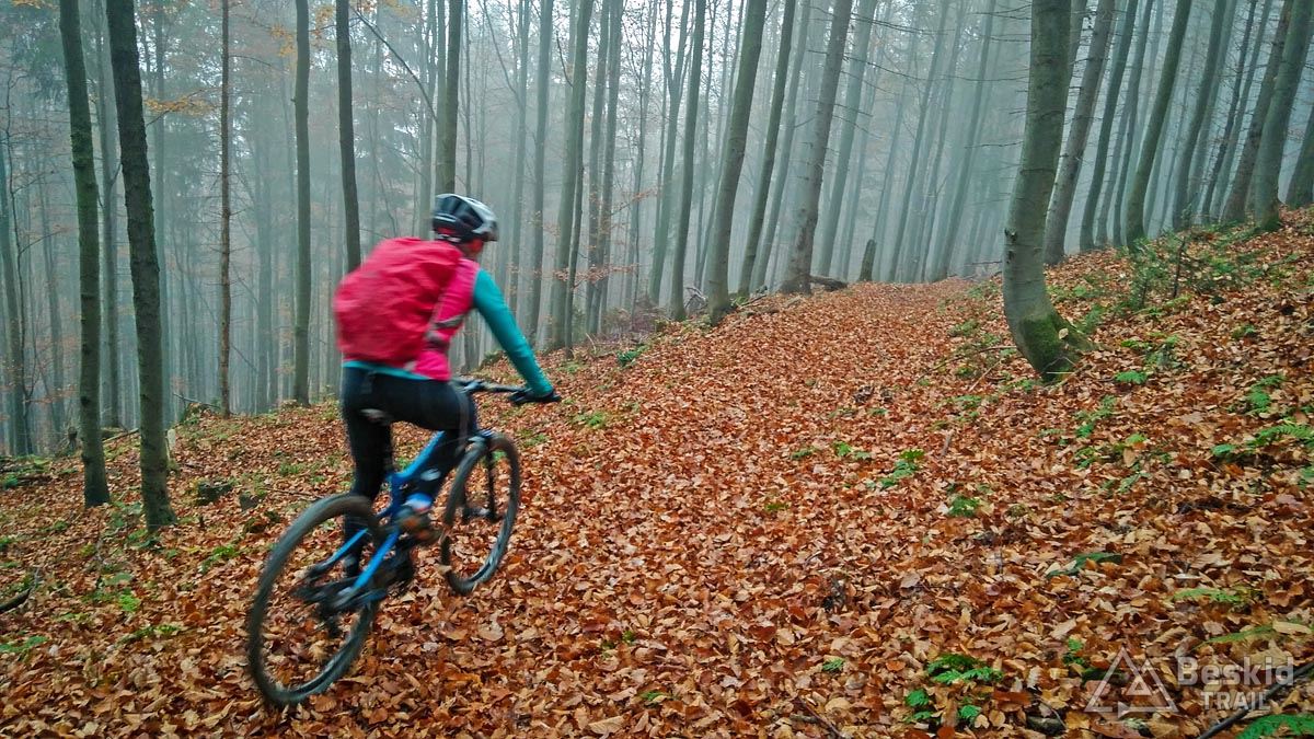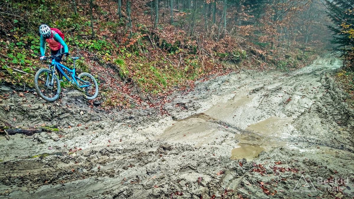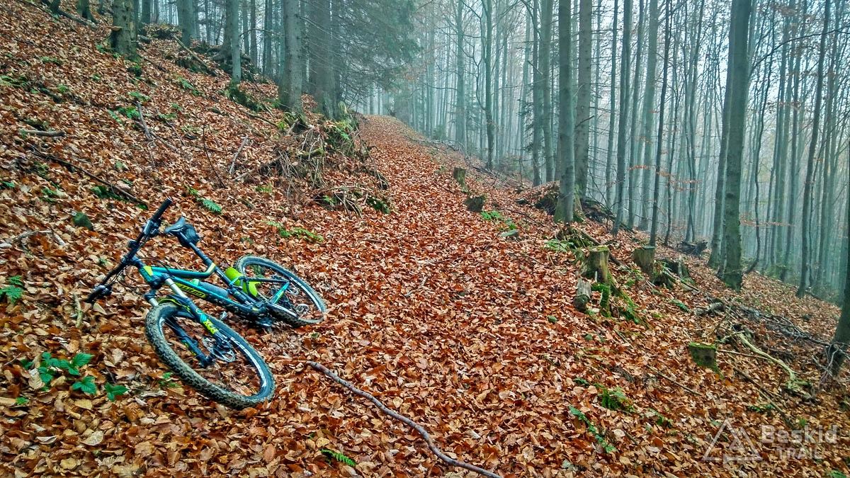 Z Przełęczy Klekociny, gdzie podjechaliśmy samochodem, by zaoszczędzić nieco czasu, ruszyliśmy dopiero o 11:15. Zaraz za przełęczą przywitała nas kompletnie zniszczona i błotnista droga zwózkowa, którą niedawno przechadzał się niedźwiedź – ze śladów wynikało, że ślizgał się tak jak my ;). Na szczęście po kilkuset metrach odbiliśmy w starą, zasypaną liśćmi dróżkę, znaną wśród rowerzystów jako trail „Myśliwski” . Nim dojechaliśmy do Hali Barankowej, i po przyjemnym przelocie grzbietem Wełczonia, wbiliśmy się na kultowy zjazd „Grzędą” , którym dotarliśmy do Zawoi. Warunki do jazdy o dziwo były dobre, podłoże wciąż suche, jedynie dalszych widoków brakowało, bo chmury skutecznie osnuły szczyty.