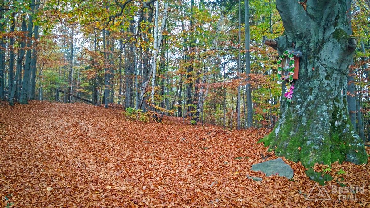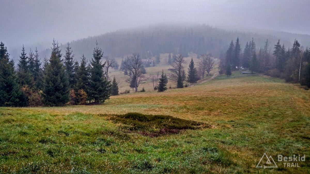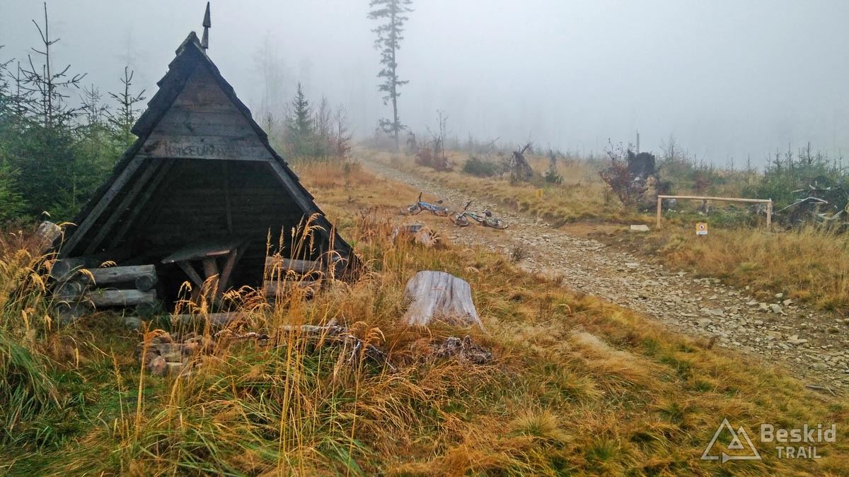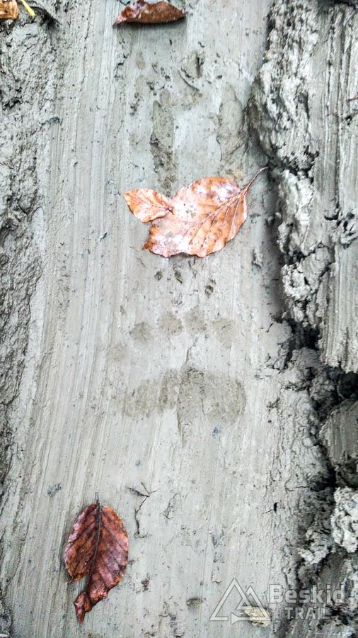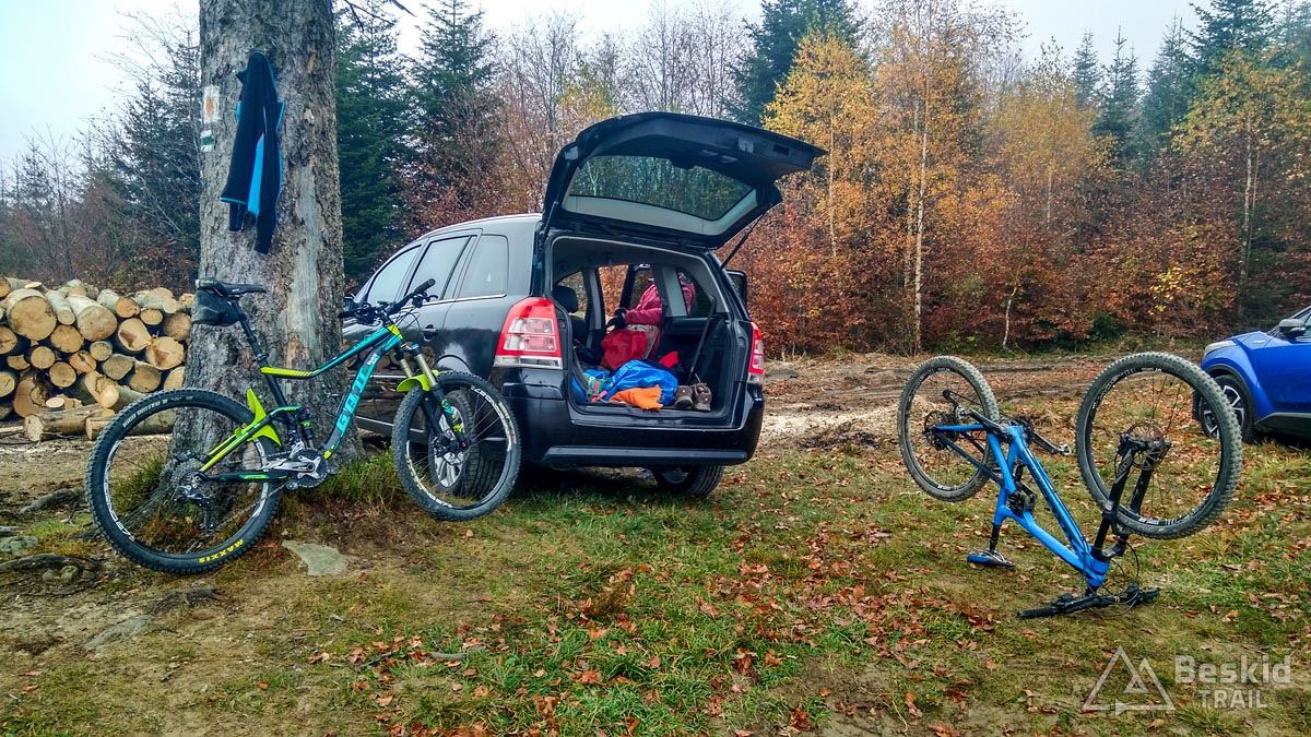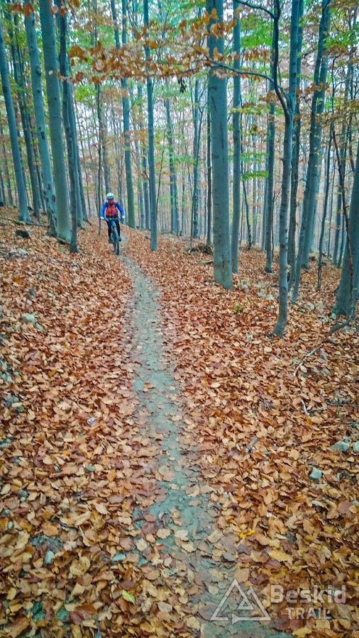 Z Przełęczy Klekociny, gdzie podjechaliśmy samochodem, by zaoszczędzić nieco czasu, ruszyliśmy dopiero o 11:15. Zaraz za przełęczą przywitała nas kompletnie zniszczona i błotnista droga zwózkowa, którą niedawno przechadzał się niedźwiedź – ze śladów wynikało, że ślizgał się tak jak my ;). Na szczęście po kilkuset metrach odbiliśmy w starą, zasypaną liśćmi dróżkę, znaną wśród rowerzystów jako trail „Myśliwski” . Nim dojechaliśmy do Hali Barankowej, i po przyjemnym przelocie grzbietem Wełczonia, wbiliśmy się na kultowy zjazd „Grzędą” , którym dotarliśmy do Zawoi. Warunki do jazdy o dziwo były dobre, podłoże wciąż suche, jedynie dalszych widoków brakowało, bo chmury skutecznie osnuły szczyty.