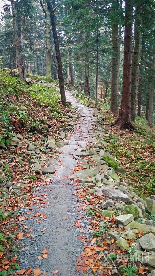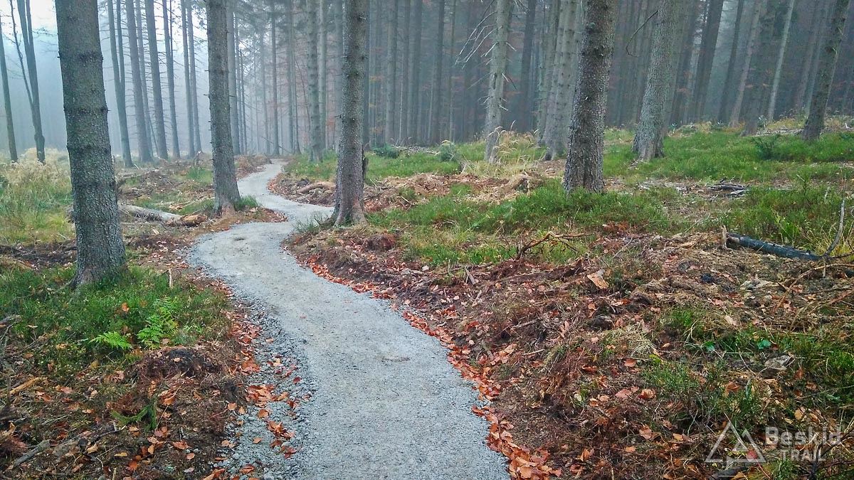 Po krótkim podjeździe główną drogą docieramy do parkingu przy starym Centrum Górskim Korona Ziemi. Centrum już opustoszało, ale dla riderów wybudowano tu punkt z toaletami, prysznicami z ciepłą wodą i myjkami do rowerów. Część podjazdu „Podbłędny” jest zamknięta, więc musimy kawałek podjechać stokówką, na szczęście po kilkuset metrach możemy wjechać na trail, będący naprawdę łatwą technicznie ścieżką o przyjemnie niedużym nachyleniu :). Jedynie kilkanaście metrów ścieżki wyłożono kamieniami w miejscu, gdzie przechodzi ona przez coś na kształt gołoborza. Poza tym odcinkiem jedzie się utwardzoną ścieżką i w spokoju można podziwiać las ;). Po drodze kilkukrotnie przecinamy trasy zjazdowe, ale jedziemy do samej góry – do górnej stacji wyciągu Mosorny Groń – ot, dla zaliczenia, bo widoki na Babią Górę trzeba sobie dziś wyobrazić.