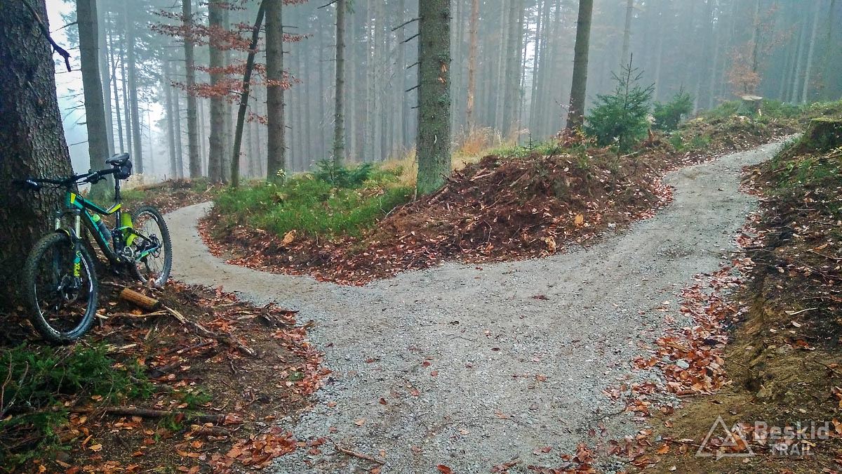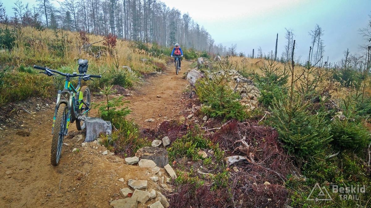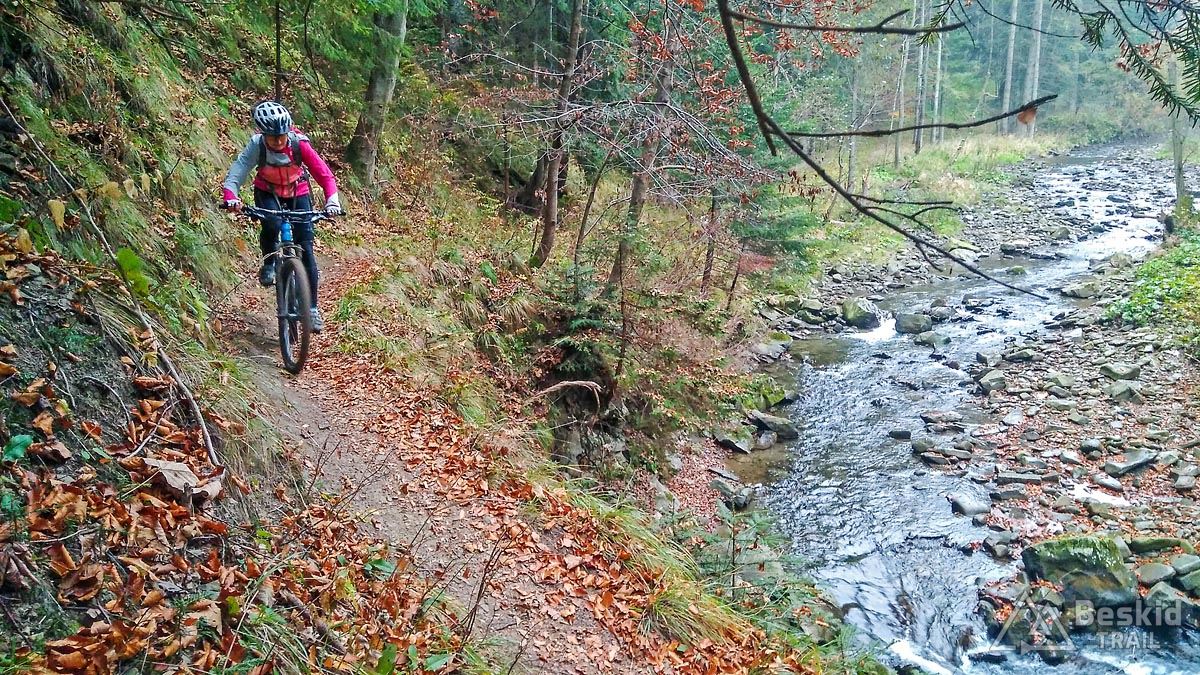 Po krótkim odpoczynku zjeżdżamy na początek najdłuższej trasy „Sokolica” . Prawie pięć kilometrów dobrego zjazdu, ze świetnymi bandami (oj, lubię takie rzeczy, a Soil spisuje się na tego typu ścieżkach fenomenalnie!), sporo hopek, stolików dla fanów hopsania, wszystkie jednak można przejechać lub objechać, jeśli nie lubimy tego typu atrakcji. Oboje przyznaliśmy, że świetnie się bawiliśmy na tej trasie :). Od razu po zjeździe zaczynamy ponowny podjazd do krótszej, ale treściwej ścieżki „Diablak” , o większym nachyleniu, bardziej naturalnym podłożu i kilku „niespodziankach” w postaci solidnych dropów. W kilku miejscach nieco mnie „przytyka”, ale dropy na szczęście można ominąć, choć nieco na dziko. Myślę, że następnym razem pójdzie lepiej ;). Zaskakująca jest końcówka zjazdu nad potokiem, malownicze miejsce z możliwością nieplanowanej kąpieli, jeśli się nie uważa. Przed mostkiem można odbić na dziką ścieżkę prowadzącą w górę ku ostatniemu trailowi, który chcemy dziś przejechać – „Rydzowemu” – tak też robimy. Jest to faktycznie ścieżka dla początkujących, łagodnie opadająca w kierunku parkingu.