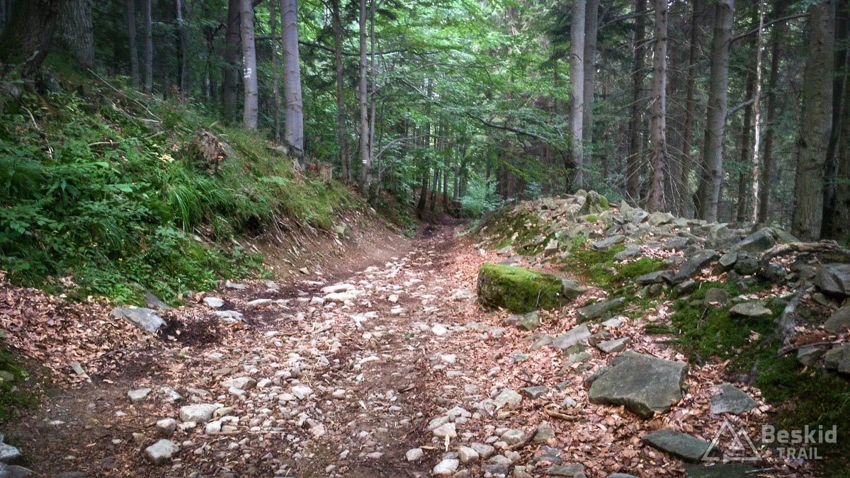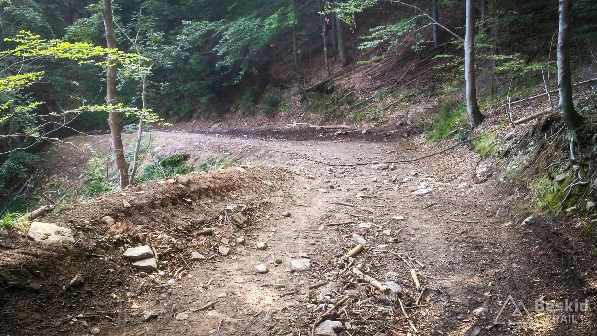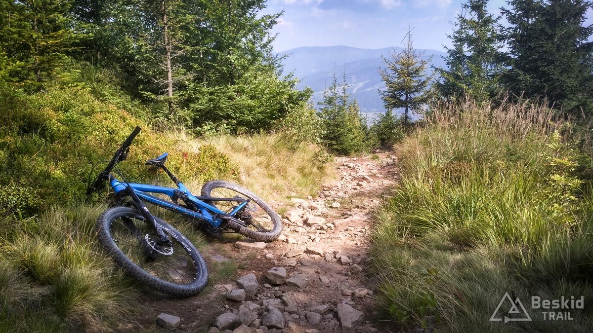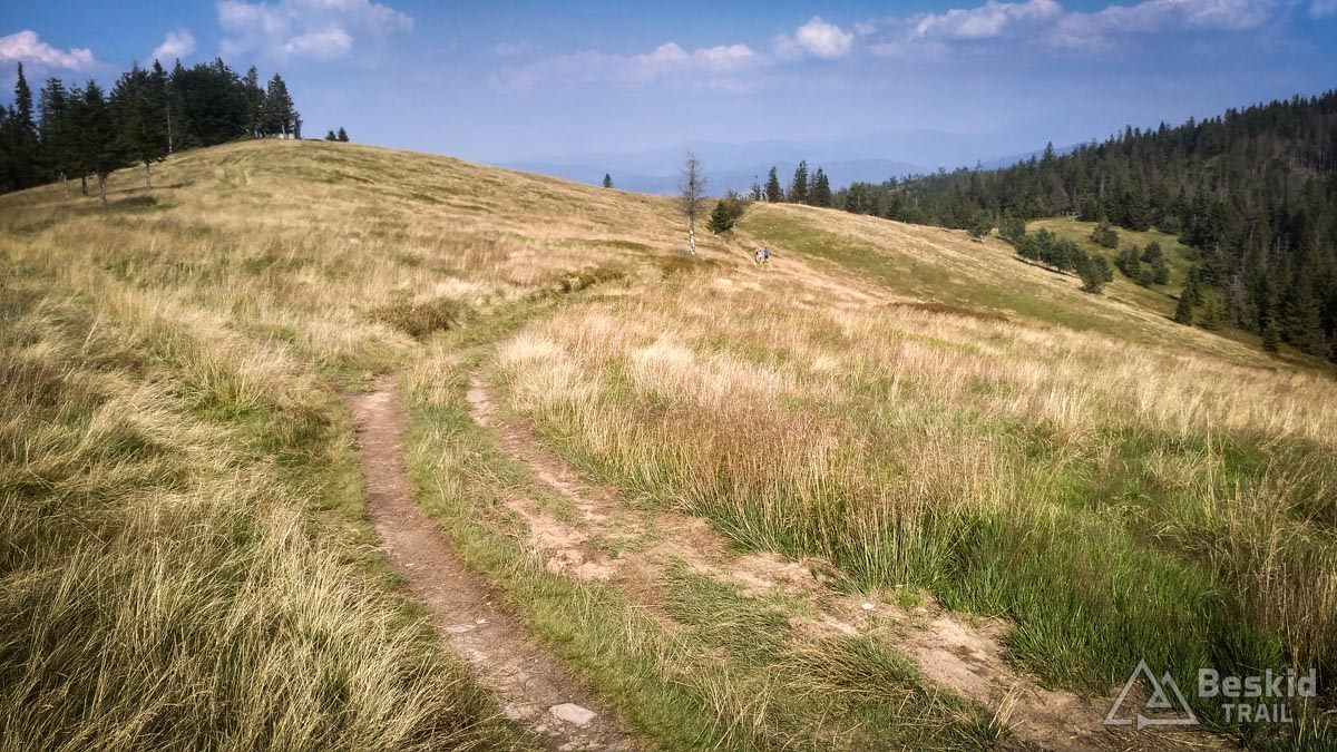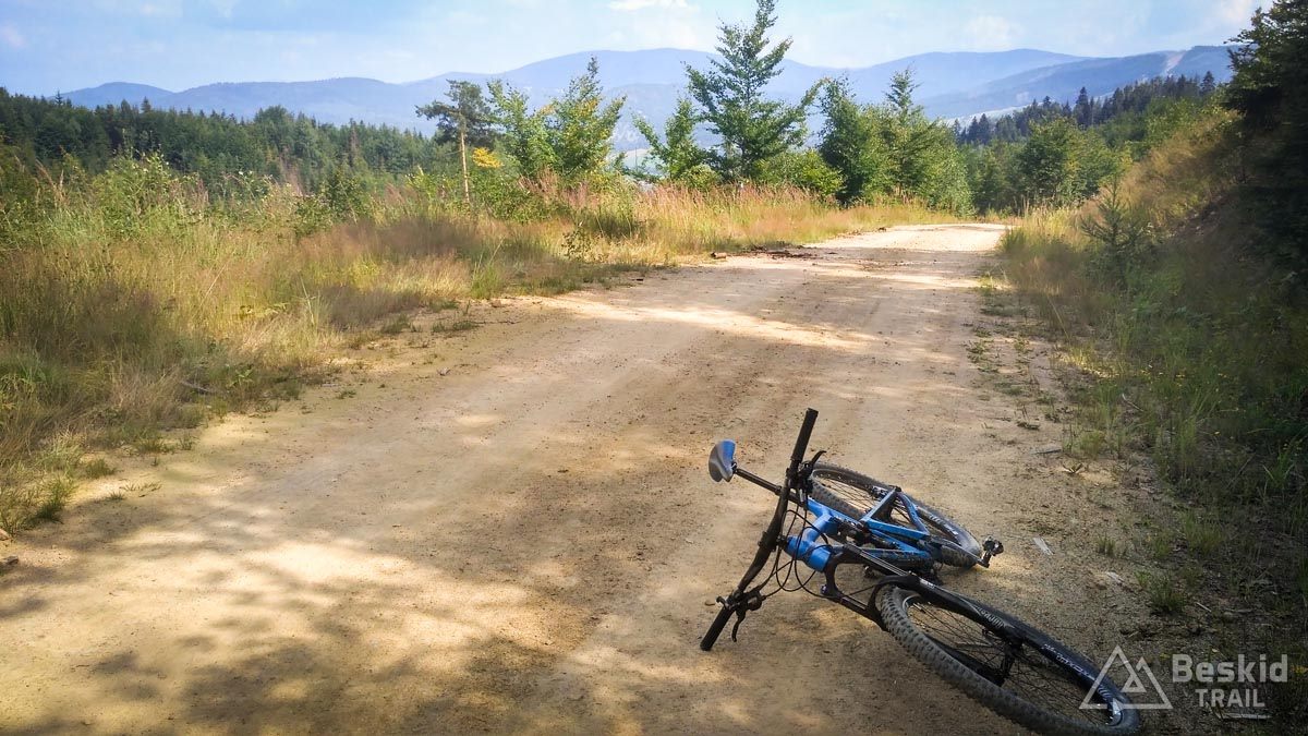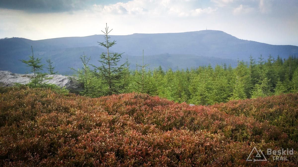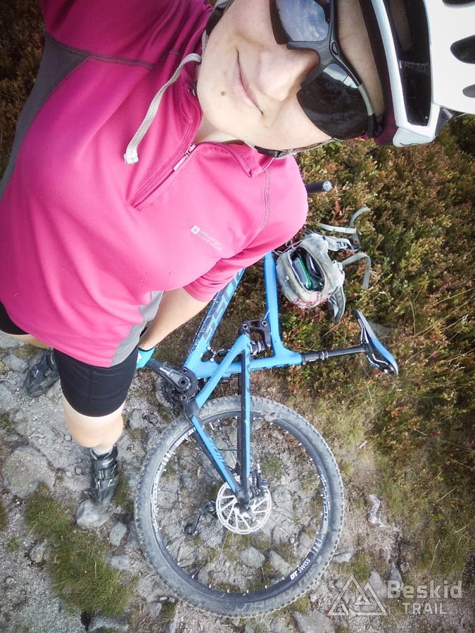 Pierwszy od dawna dzień bez prognoz burzowych zmotywował mnie do dojazdu rowerem do pracy i tak, po zakończonej o 15 dniówce, mogłam od razu ruszyć na szlak. Dla rozgrzewki podjeżdżam asfaltem wzdłuż zielonego szlaku z Węgierskiej Górki w stronę Kubisówki, jednak gdy asfalt się kończy wjeżdżam na stokówkę prowadzącą w stronę czerwonego szlaku na Glinne. Po kilkunastu minutach docieram do szlaku, gdzie niestety czeka mnie spore rozczarowanie-ciężki sprzęt zniszczył i poszerzył ścieżkę, która stała się bardziej „wjeżdżalna”, ale straciła sporo swojego uroku. Na szczęście powyżej drugiej stokówki, na wysokości około 900 m n.p.m. wpadam na wąski singiel, który prowadzi aż na Glinne (z krótkim elementem podejściowym). Po drodze zaczepiają mnie oczywiście krzaki borówek, którym nie potrafię, i nie zamierzam się oprzeć :). Na szczycie Glinnego nie bawię długo, zjeżdżam do stokówki i do niebieskiego szlaku, by trawersem ominąć nieprzejezdny w górę fragment czerwonego szlaku przed Halą Radziechowską.