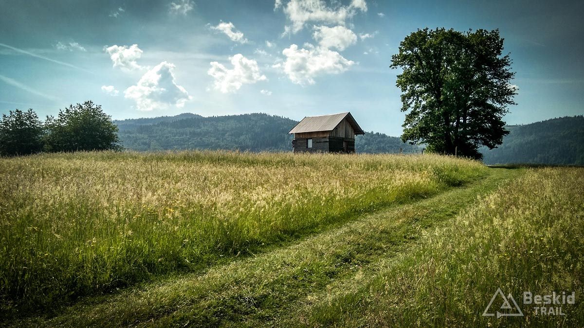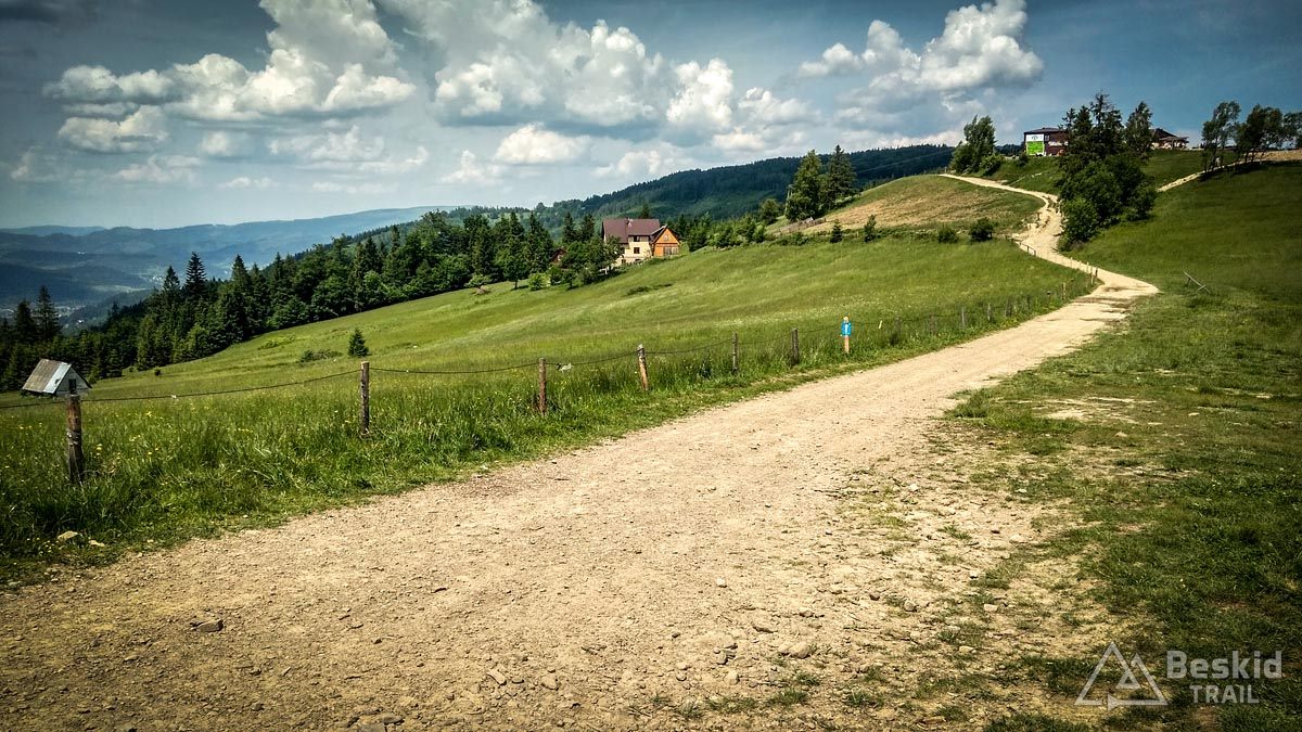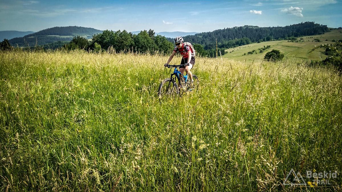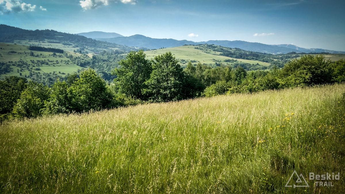 Startujemy więc rano z Żywca i podjeżdżamy pod Grojcem, obok stadniny na przełęcz nad Trzebinią. Tam zamiast prosto na Wójtowski Wierch, skręcamy w prawo i łąkowymi dróżkami zjeżdżamy do Brzuśnika. Zdecydowanie warty polecania przejazd, zarówno na początek dłuższej trasy jak i na krótką popołudniową wycieczkę – przepięknie!
