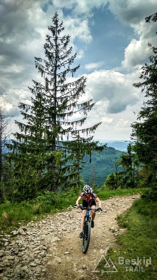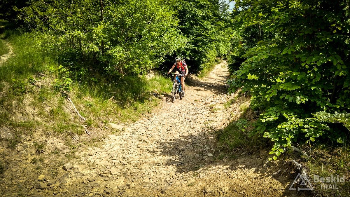Zjeżdżamy więc na Halę Pawlusią i czerwonym szlakiem trawersujemy Romankę od zachodu. Kilka powalonych drzew zmusza nas do przenoszenia roweru, ale ogólne wrażenia z jazdy pozostają niezmącone – jest super! Każdy z fragmentów tego szlaku ma w sobie coś innego do zaoferowania: początek to sporo kamieni, które odpowiednio trzeba przejechać/najechać/ominąć by nie wybić się z rytmu zjazdowego. Środkowa część to singlowy trail, z korzeniami, trochę kamieni i miejscami nieco luftu ;). Dolny odcinek to szersza ścieżka, ze sporą ilością kamieni.