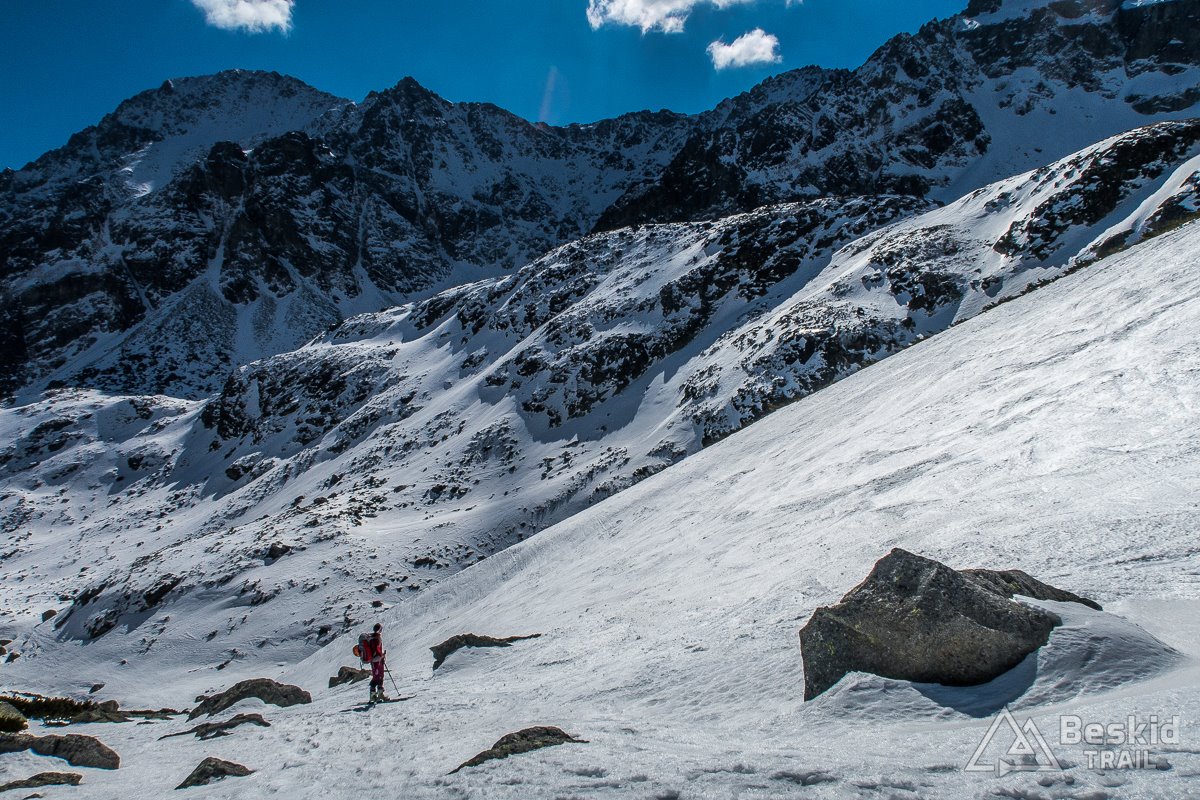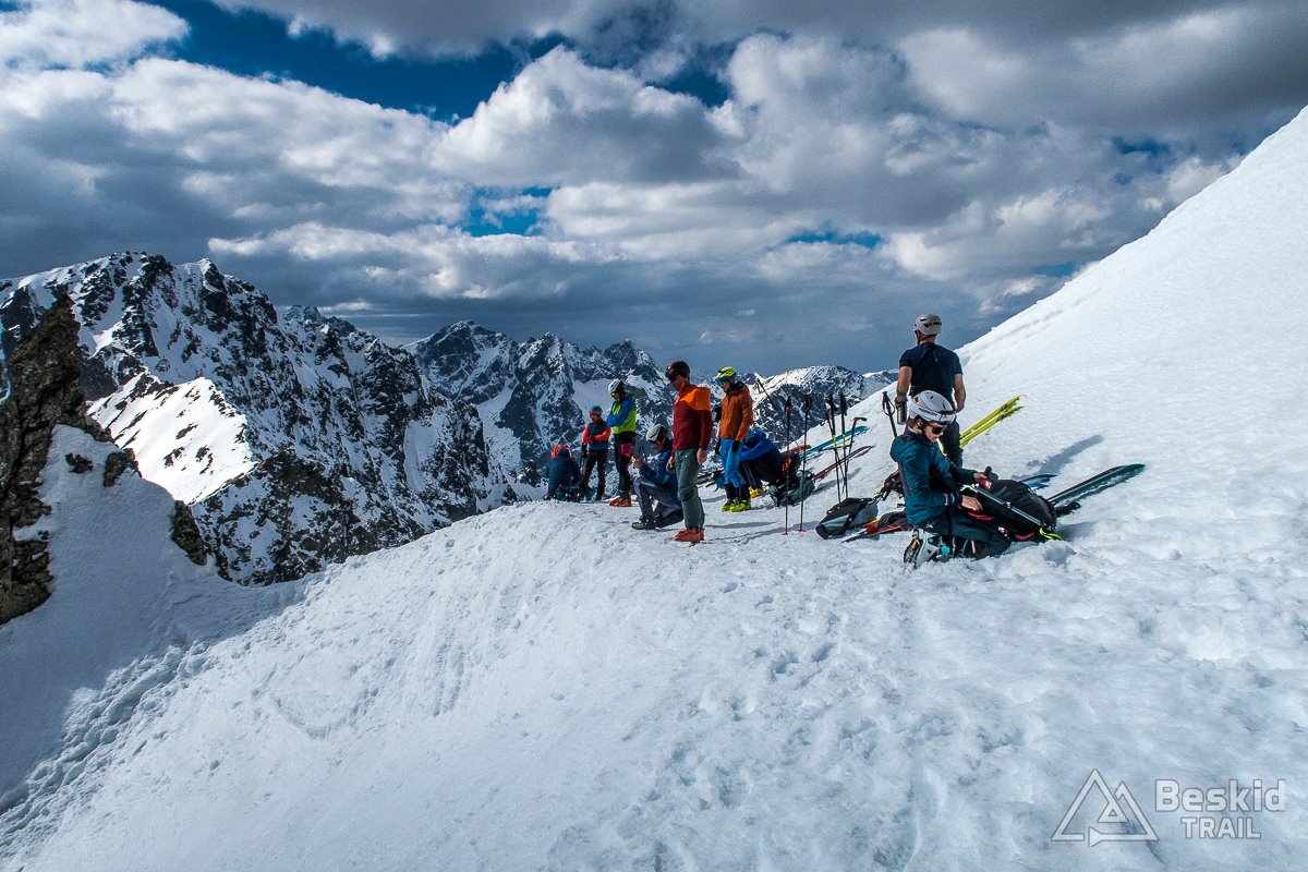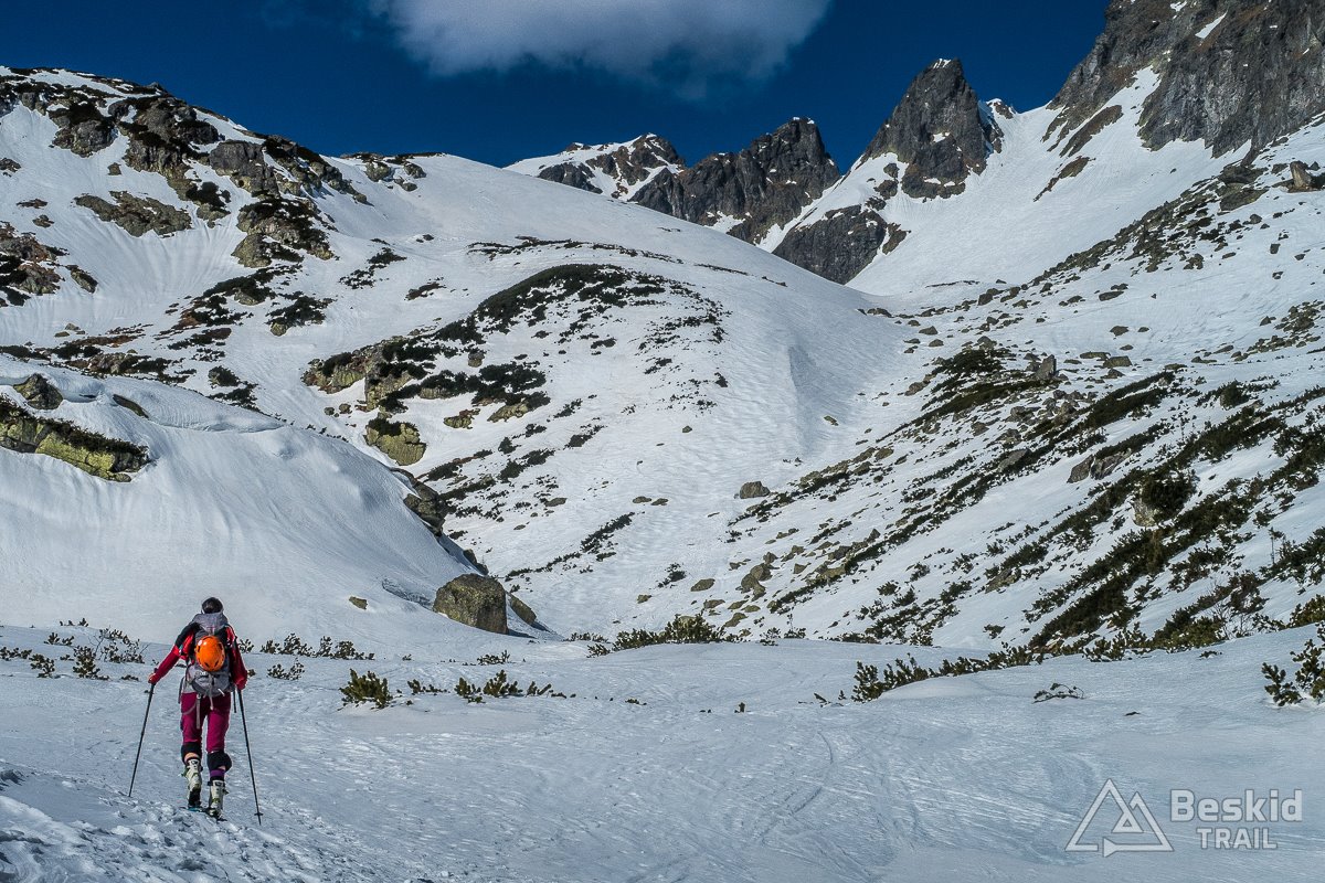 Za główny cel naszej wycieczki obraliśmy Zawracik Rówienkowy (słow. Malý Závrat, 2270 m n.p.m). A co uda się więcej zrobić, postanowiliśmy ocenić i zdecydować już na miejscu, po zjechaniu z pierwszej przełączki. Za Hrebeniokiem udało się już założyć narty, i całkiem sprawnie podeszliśmy pod Zbójnicką Kopkę (2098 m n.p.m), gdzie w ciepłych promieniach słońca i bezwietrznej aurze, zrobiliśmy przerwę na drugie śniadanie.