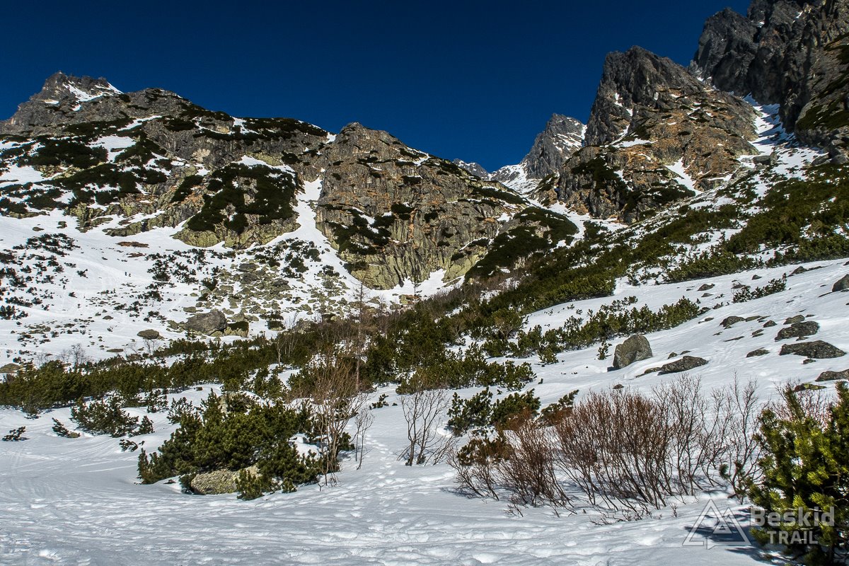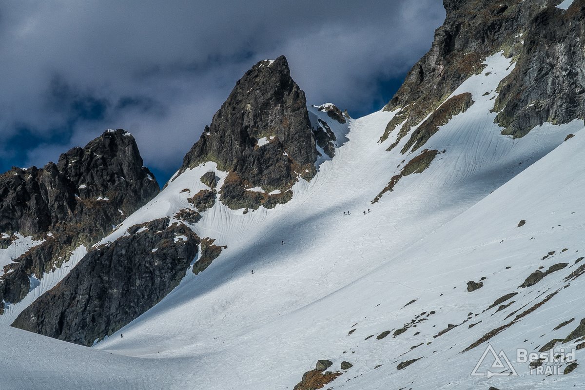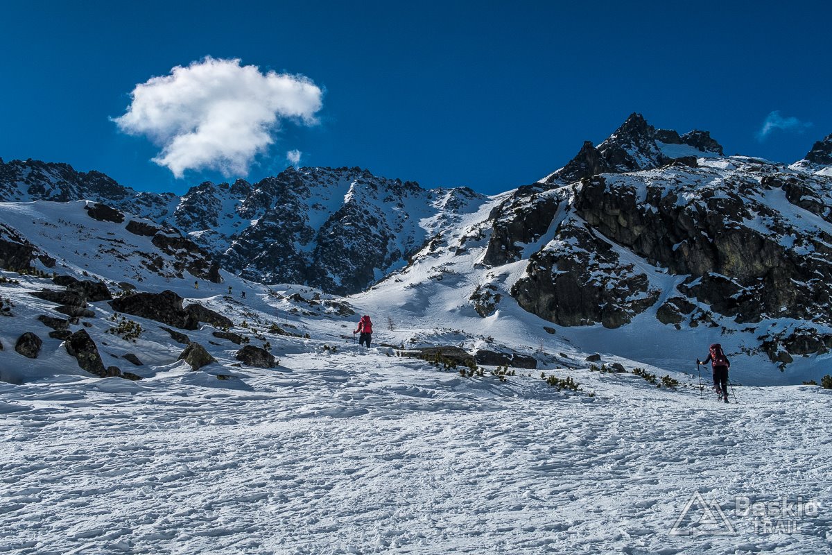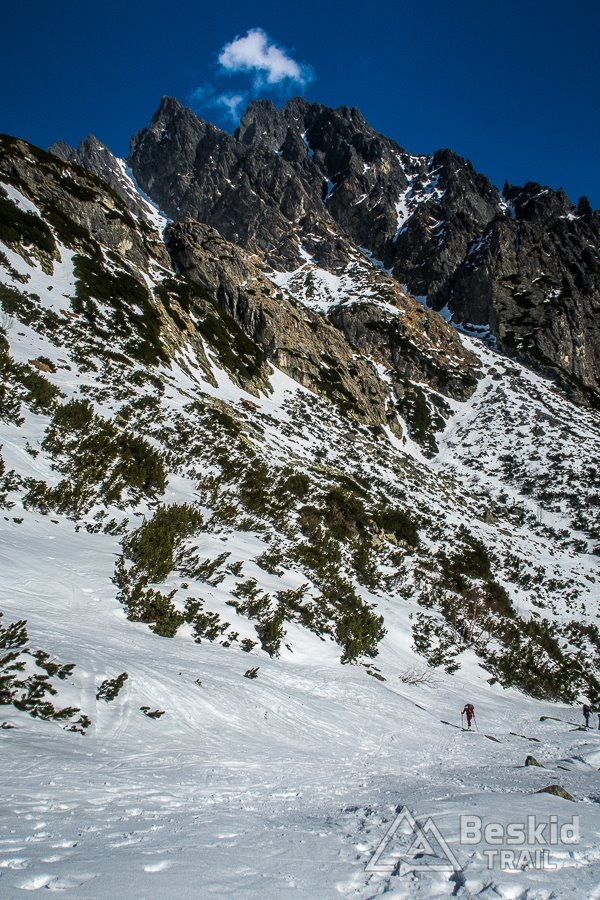 Za główny cel naszej wycieczki obraliśmy Zawracik Rówienkowy (słow. Malý Závrat, 2270 m n.p.m). A co uda się więcej zrobić, postanowiliśmy ocenić i zdecydować już na miejscu, po zjechaniu z pierwszej przełączki. Za Hrebeniokiem udało się już założyć narty, i całkiem sprawnie podeszliśmy pod Zbójnicką Kopkę (2098 m n.p.m), gdzie w ciepłych promieniach słońca i bezwietrznej aurze, zrobiliśmy przerwę na drugie śniadanie.