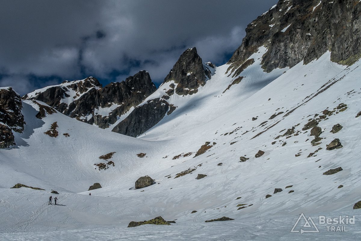 Postanowiliśmy więc zajrzeć do sąsiedniej dolinki, by przyjrzeć się jeszcze ewentualnym zjazdom. A jak już podeszliśmy te kilkaset metrów dalej, to naszym oczom ukazały się bardzo dobrze wyśnieżone dwa zbocza: pierwsze z okolic Świstowej Przełęczy (2192 m n.p.m.) , a po prawej długie i ciekawie nachylone z Graniastej Turni (słow. Hranatá veža, 2260 m n.p.m.)