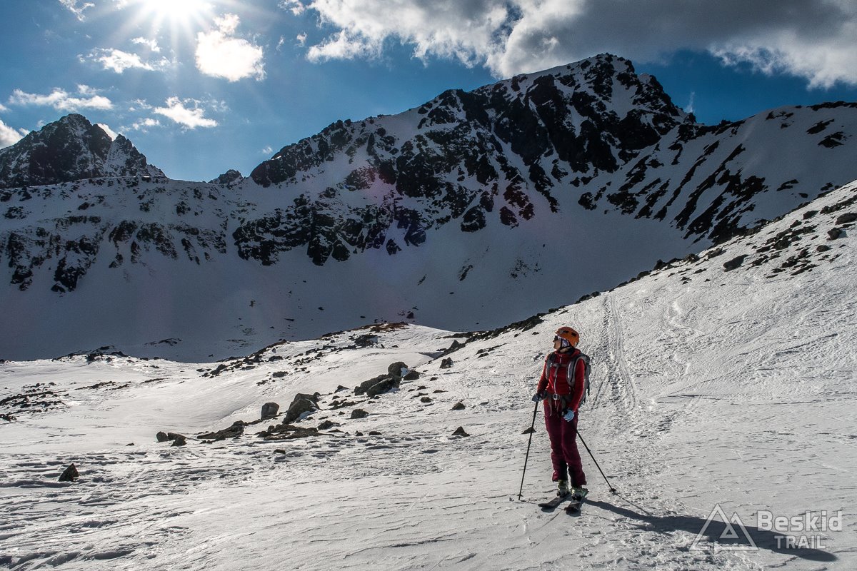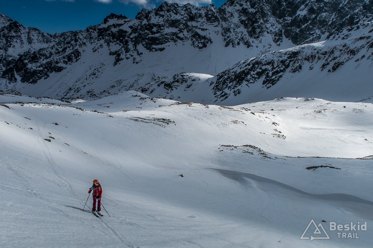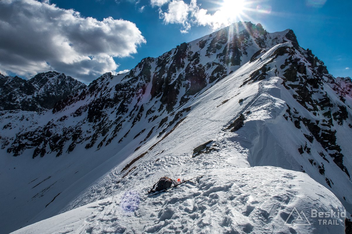 Na dole, obok zamarzniętej tafli Małego Pustego Stawku szybko założyłem foki, i ruszyłem w kierunku Oli, by wyjść jeszcze na Świstową Przełęcz. Kilka zakosów, trochę już ujeżdżających spod nart, ale sprawnie udało się wejść na grań. Na górze mała sesja zdjęciowa i wciąż wspaniała, choć już przeplatana chmurami, widokowa pogoda. Chętnie zostalibyśmy tam znacznie dłużej, gdyby nie fakt, że wraz z coraz niżej położonym słońcem, odpuszczone wcześniej śniegi zaczynały zamarzać i ostatni zjazd mógł być niezbyt przyjemny.