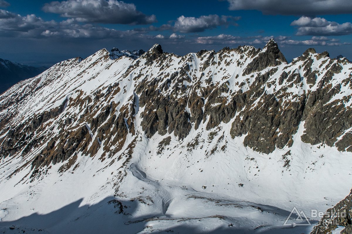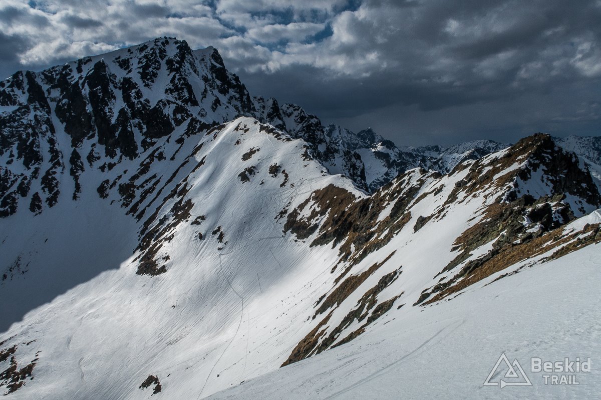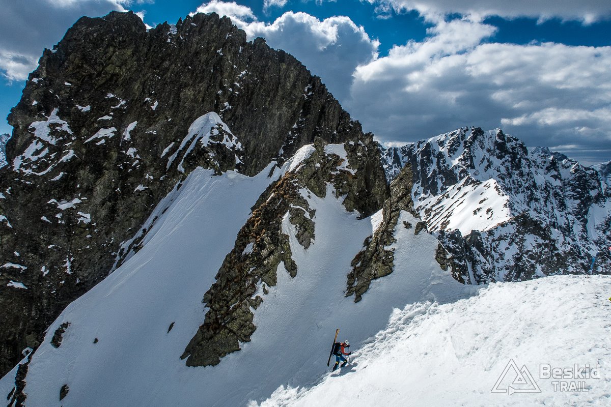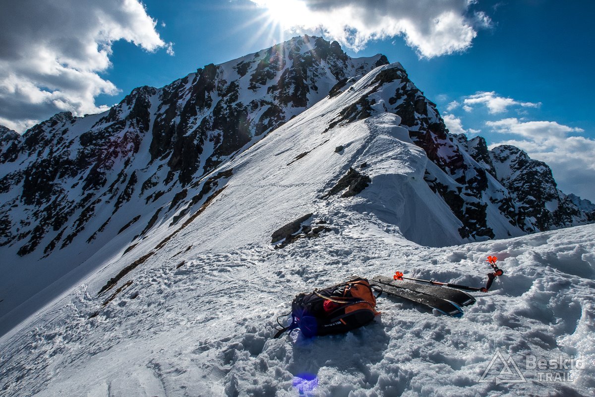 Na dole, obok zamarzniętej tafli Małego Pustego Stawku szybko założyłem foki, i ruszyłem w kierunku Oli, by wyjść jeszcze na Świstową Przełęcz. Kilka zakosów, trochę już ujeżdżających spod nart, ale sprawnie udało się wejść na grań. Na górze mała sesja zdjęciowa i wciąż wspaniała, choć już przeplatana chmurami, widokowa pogoda. Chętnie zostalibyśmy tam znacznie dłużej, gdyby nie fakt, że wraz z coraz niżej położonym słońcem, odpuszczone wcześniej śniegi zaczynały zamarzać i ostatni zjazd mógł być niezbyt przyjemny.